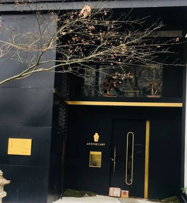 颇有日式枯山水庭院风格的门面,让药剂师在附近店铺中格外显眼,经典沉稳的黑色立面与庭院地面白色沙石形成强烈对比,高调而不浮夸,内敛中有着骄傲,这也是药剂师整体的特质。